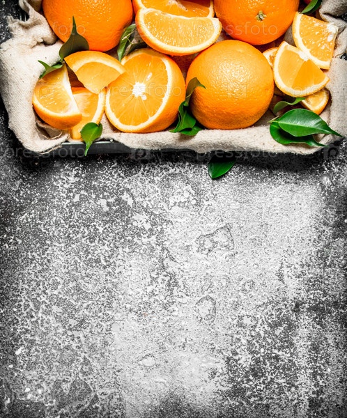 Рубленые кусочки апельсинов в коробке с зелеными листьями