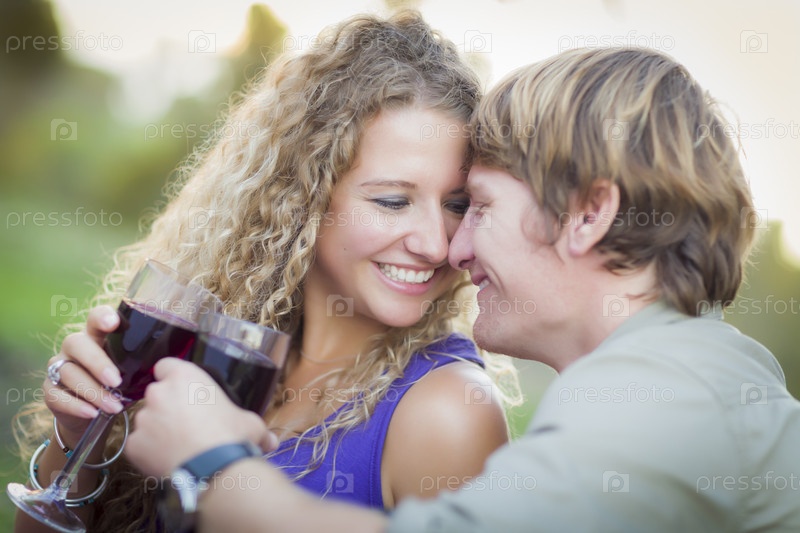 Привлекательная пара наслаждается вином в парке