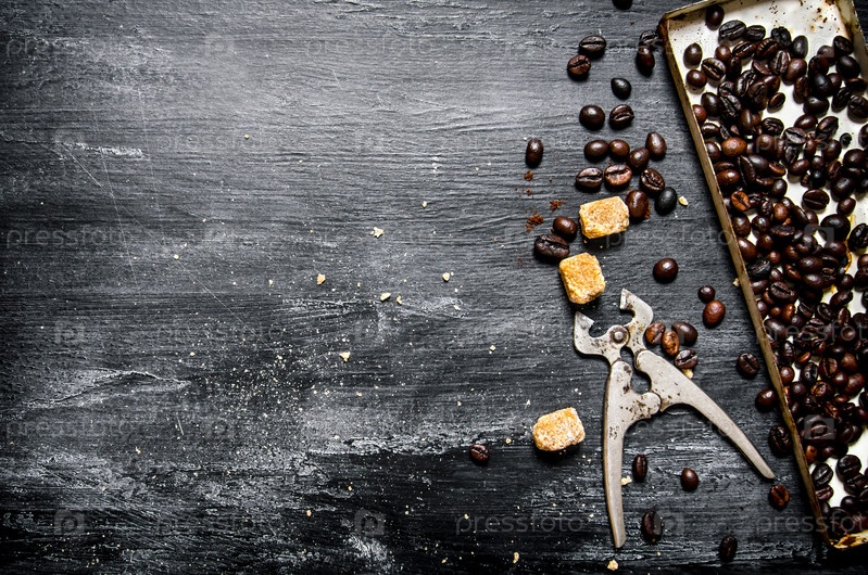 Свежий жареный кофе зерна с щипцами для сахара