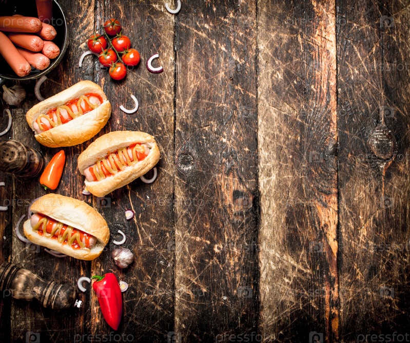 Свежие горячие хот-доги с перцем, луком и помидорами