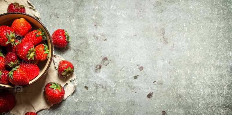 Спелая клубника в миске на старой ткани