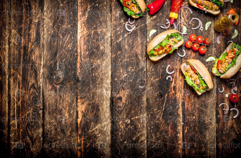 Хот-доги с горчицей, острым соусом, луком и зеленью