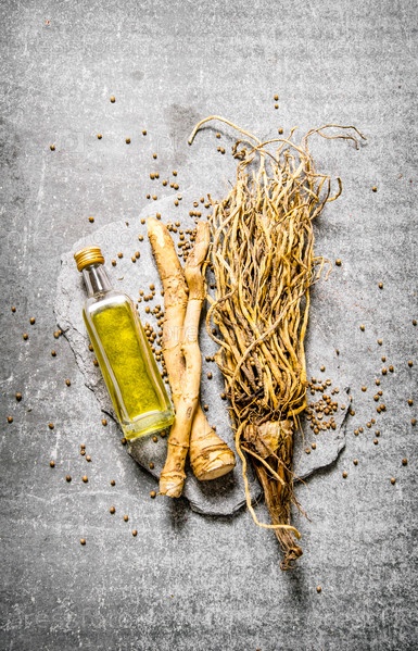 Травы с оливковым маслом в бутылке на каменной подставке