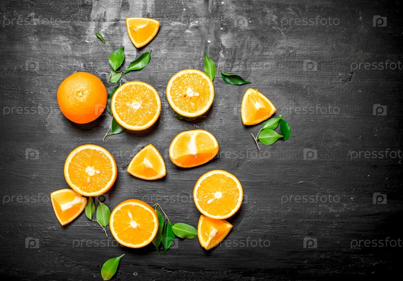 Свежие апельсины с зелеными листьями