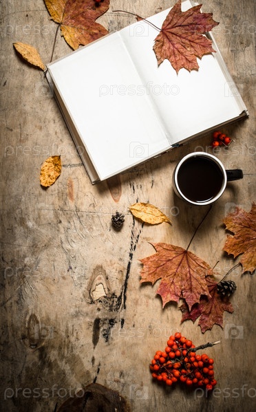 Осенний стиль. Открытая книга с чашкой горячего кофе