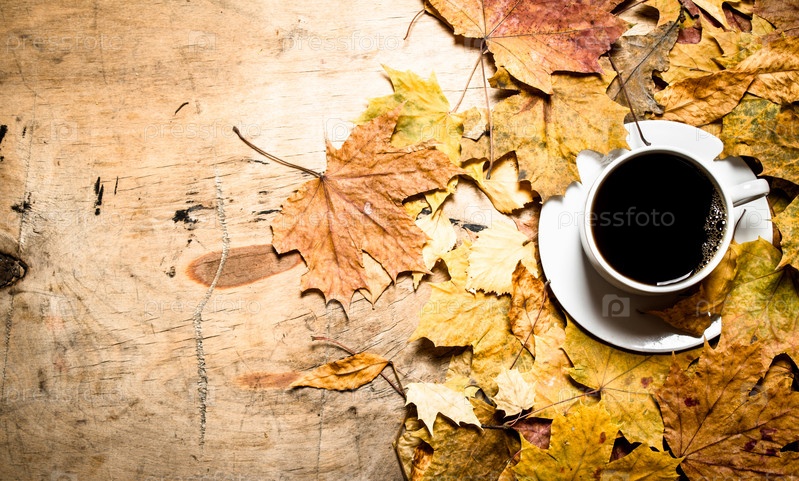 Осенний стиль. Чашка горячего кофе с кленовыми листьями
