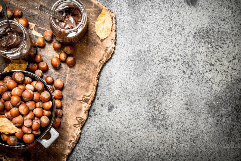 Ореховое масло из фундука и шоколада. На деревенском фоне