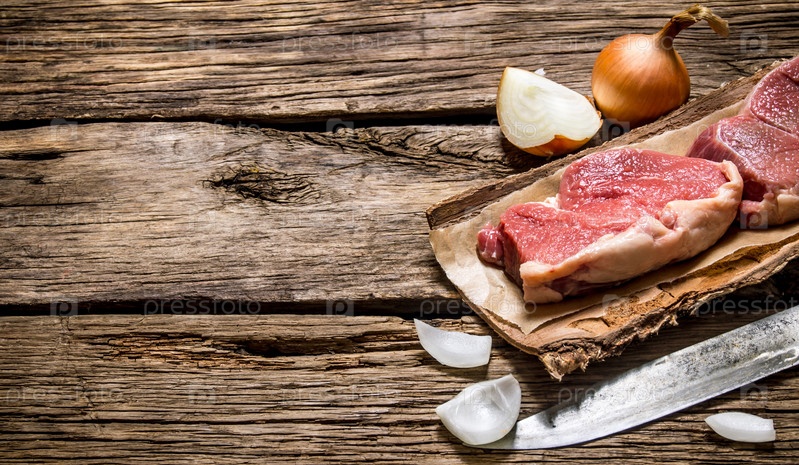 Свежее сырое мясо с ножом и луком