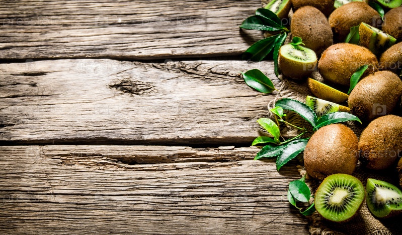 Свежее киви с листами. На деревянном фоне