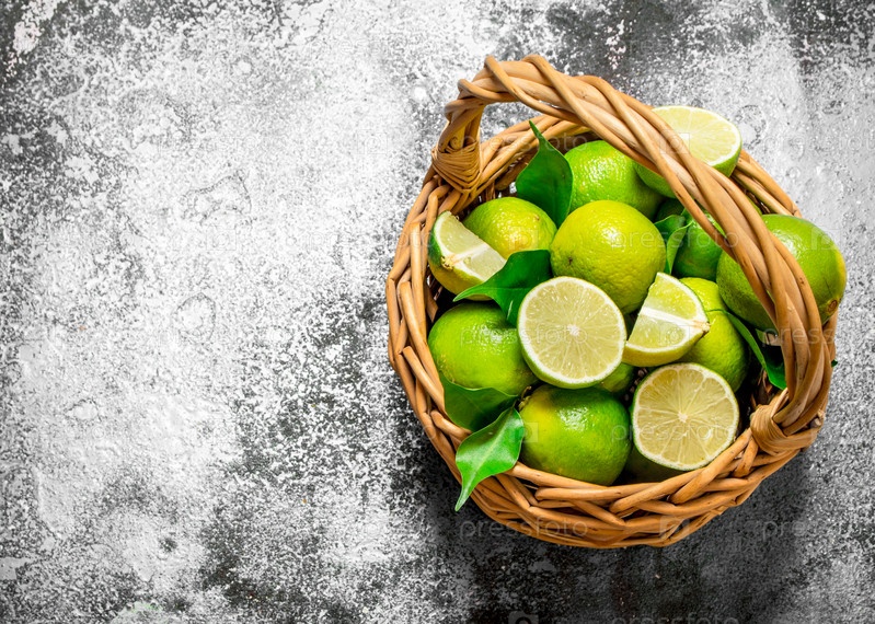 Лимоны в корзине с зелеными листьями