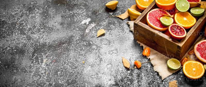 Свежие цитрусовые фрукты в старом ящике