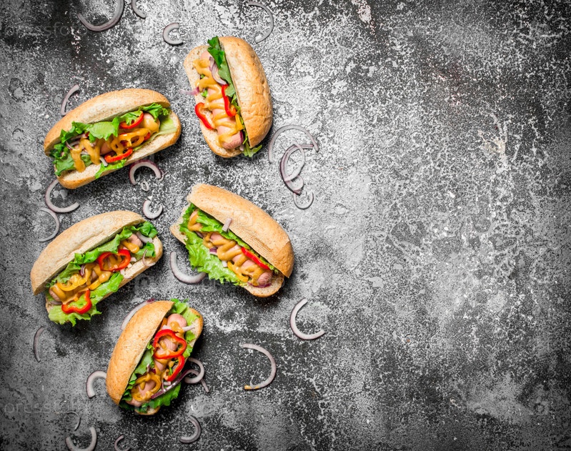 Вкусные хот-доги с томатным соусом, горчицей и зеленью