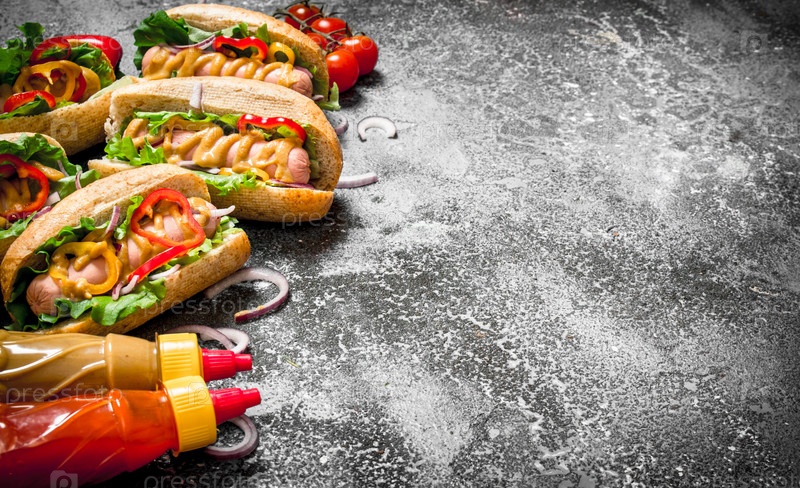 Вкусные хот-доги с томатным соусом, горчицей и зеленью