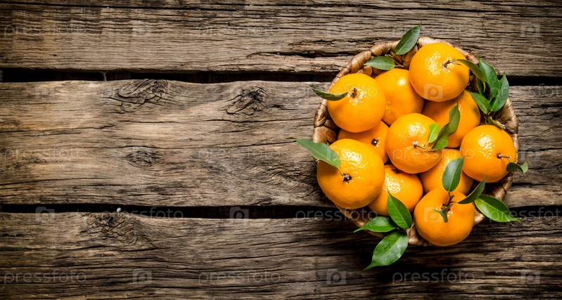 Свежие мандарины с листьями в корзине