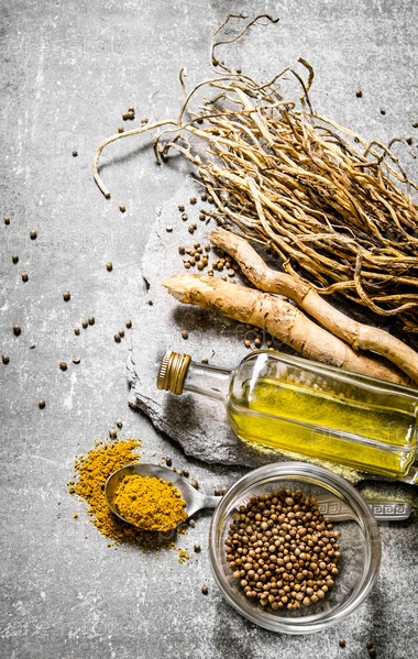 Специи, зелень и оливковое масло на каменной подставке