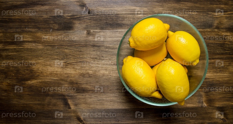 Свежие лимоны в стеклянной чашке. На деревянном столе