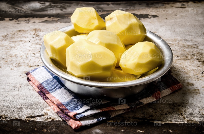 Очищенный картофель в металлической миске на деревенском фоне