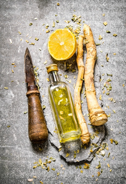 Старый нож, специи с лимоном и оливковым маслом. На каменном столе