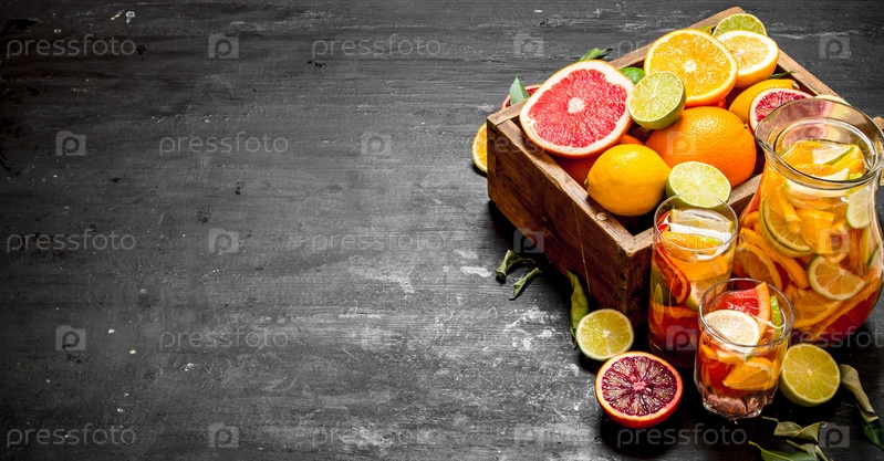 Свежий цитрусовый сок с кусочками лайма, апельсины, грейпфруты и лимона