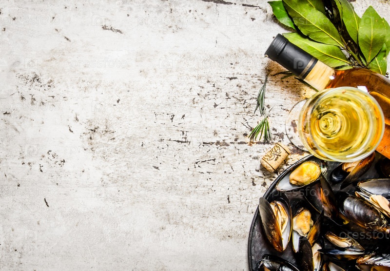Моллюски на подносе с вином