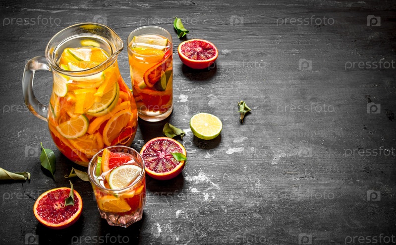 Свежий цитрусовый сок с кусочками лайма, апельсины, грейпфруты и лимоны