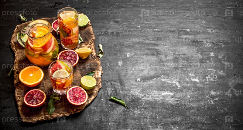 Свежий цитрусовый сок с кусочками лайма, апельсины, грейпфруты и лимоны