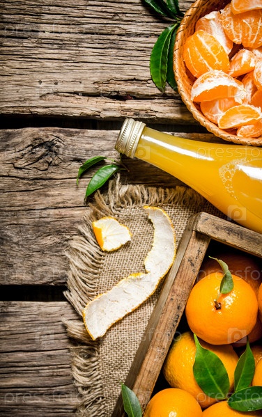 Сок в бутылке и ящик мандаринов