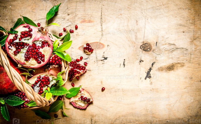 Свежие гранаты в корзине с листьями
