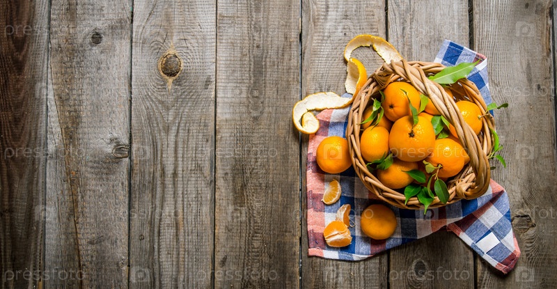 Свежие мандарины с листьями в корзине