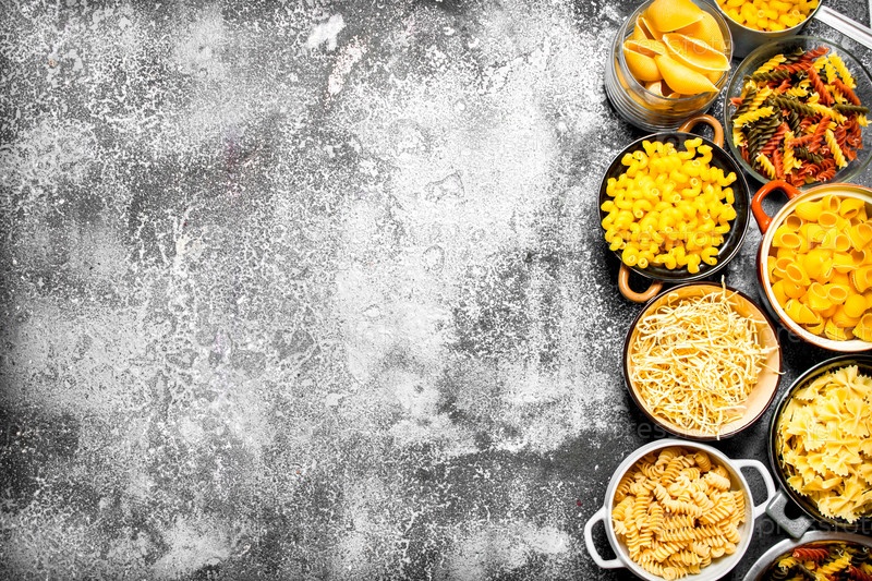 Много различных макаронных изделий в мисках