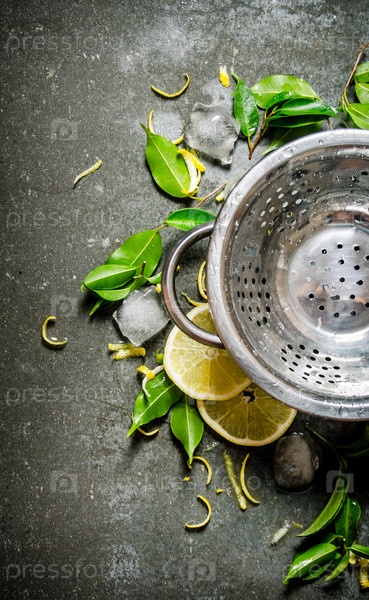 Пустой дуршлаг с листьями, нарезанным лимоном, цедрой и льдом вокруг