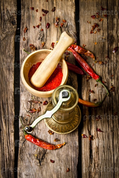 Старая мельница и ступка с молотым красным перцем чили