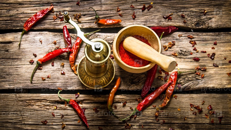 Старая мельница и ступка с молотым красным перцем чили