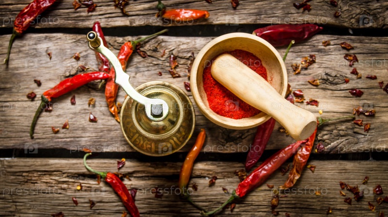 Старая мельница и ступка с молотым красным перцем чили