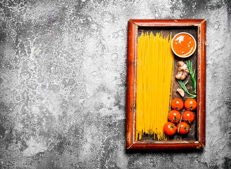 Спагетти с соусом и помидорами в старом подносе