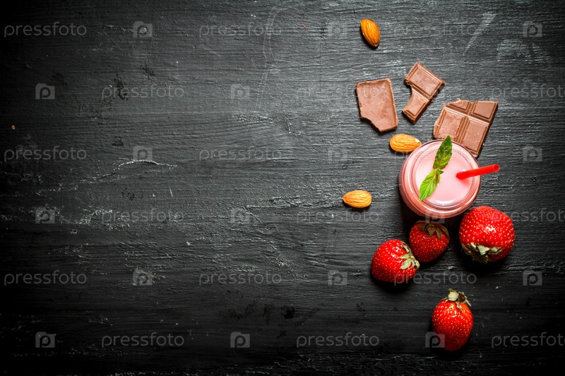 Клубничный коктейль с ягодами, кусочками шоколада и миндаля