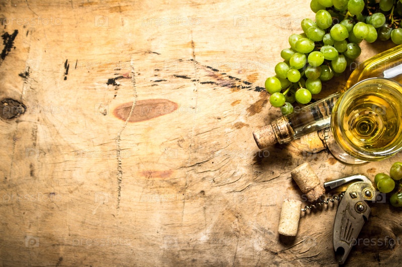Букет из белых сортов винограда с вином, штопором и пробкой