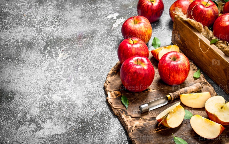 Красные яблоки на разделочной доске с коробкой