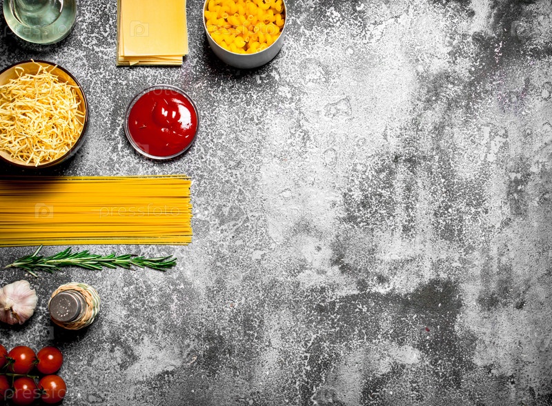 Различные макароны с томатным соусом, специями и розмарином
