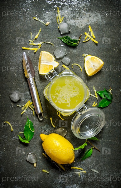 Лимонный сок в банке с цедрой, листьями и льдом