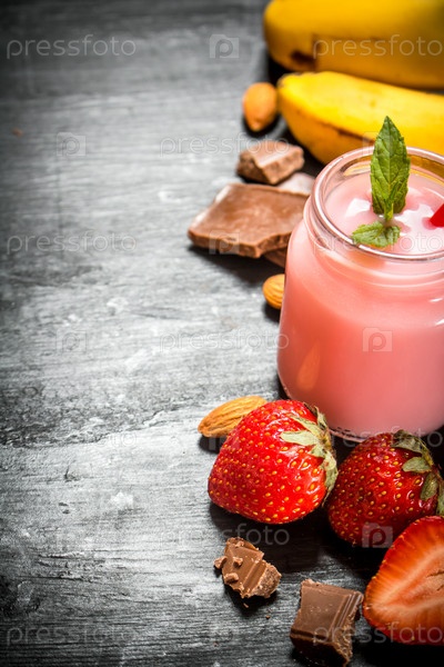 Клубничный коктейль с ягодами, шоколадом, орехами и бананами