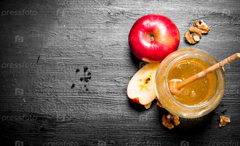 Мед в банке с кусочками спелых яблок и орехов