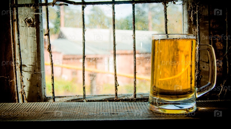 Стакан свежего пива на деревянной полке. На фоне старого окна