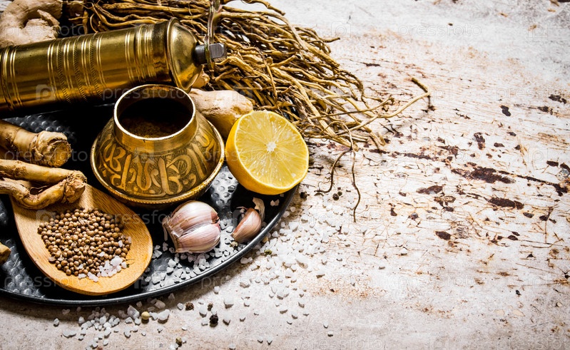 Старая мельница со специями и травами на подносе
