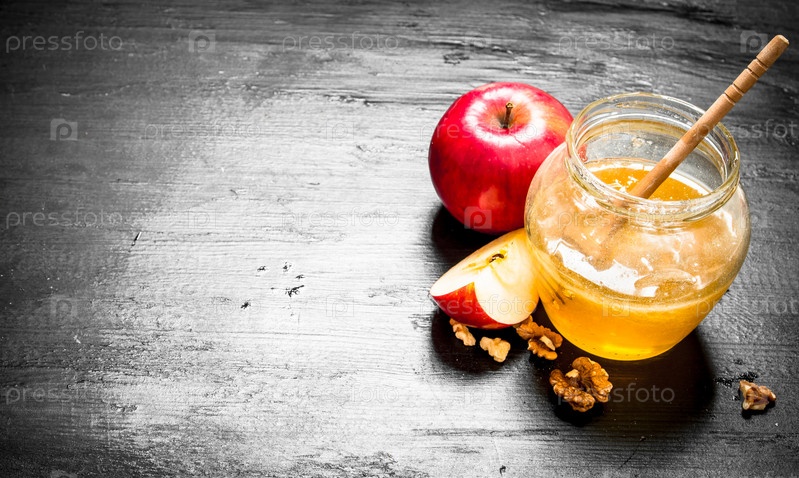 Мед в банке с кусочками спелых яблок и орехов