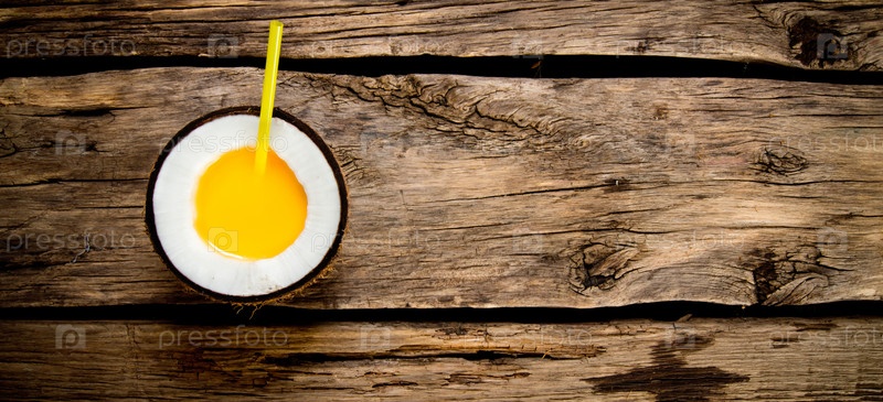 Свежий коктейль в кокосовой чашке на деревянном фоне