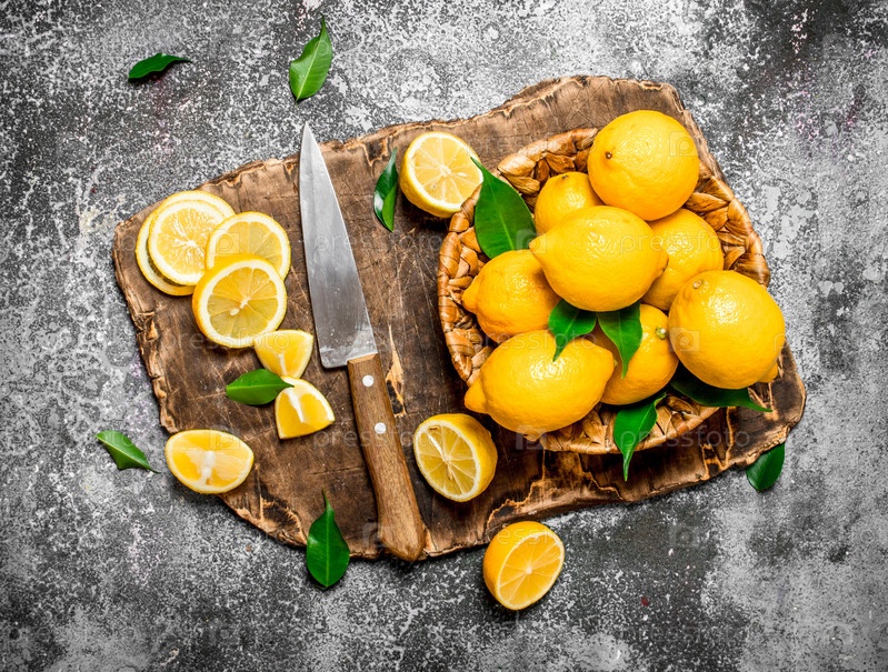 Свежие лимоны в корзине с ножом на разделочной доске