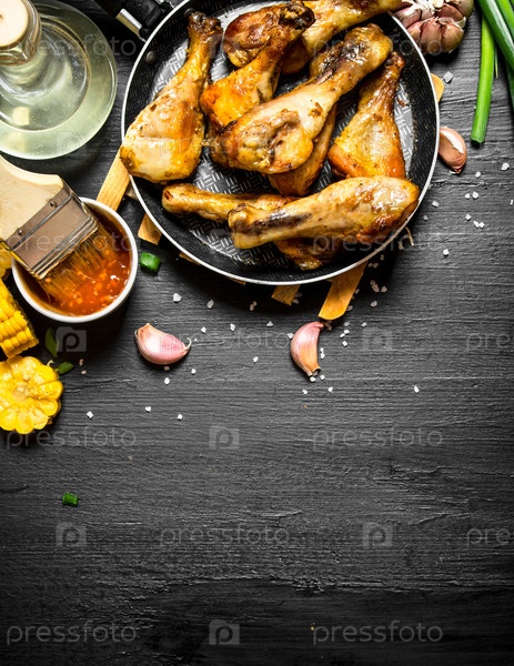 Жареные куриные ножки с кусочками кукурузы и соусом