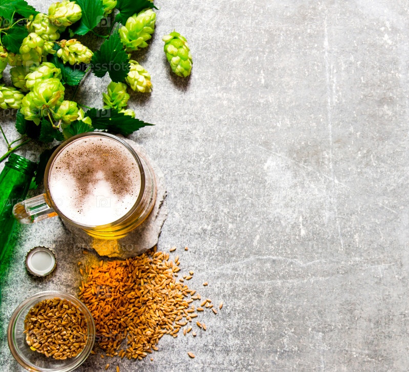 Пиво, зеленый хмель и солод на каменной поверхности