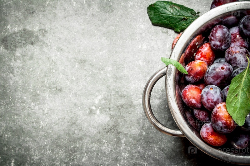 Спелые сливы с зелеными листьями